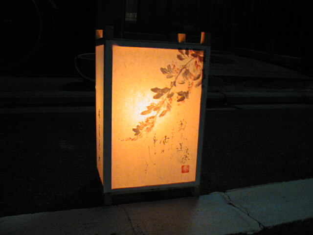 姉小路界隈を考える会では昨年度、祇園祭宵山・地蔵盆・大晦日にあわせて、看板のライトアップと手作り行灯で界隈の夜を演出するというイベントを開催し、大変好評を頂きました。そこで今年も地蔵盆にあわせ、「看板」とともに今年度のテーマでもある「花と緑」にもスポットをあて、さらに箏の演奏を加えて、「灯りと音」で界隈を演出いたしました。