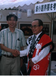 (ご芳名紹介) 内原智史 加藤健 木村祥刀 桑原康穂 佐藤光男 下前幸秀 高岡武 広瀬慎也 前田繁夫 柳池中学校の生徒達 「姉小路界隈を考える会」の展示をご覧になる枡本京都市長