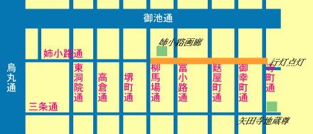 姉小路界隈を考える会では、大晦日、除夜の鐘を合図に百八基の手作り行灯を点灯して1999年の新年を迎える深夜のイベントを行いました。