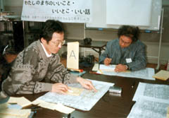 ワ−クショップは7〜8人のグループに分かれて姉小路周辺の町の状況などを話し合った。続いて、各グル−プごとに決めたル−トに沿って、現地調査に出かけ、町の良さや変化を再発見した。その後、柳池中学校に戻り、各グル−プで本日のまとめを行い、発表しあった。(詳しい内容は報告書16号に掲載予定)