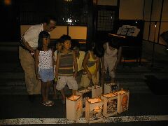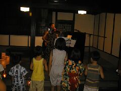 | 行灯と記念撮影 | 赤松さんの演奏に聞きいる子供達 | ||