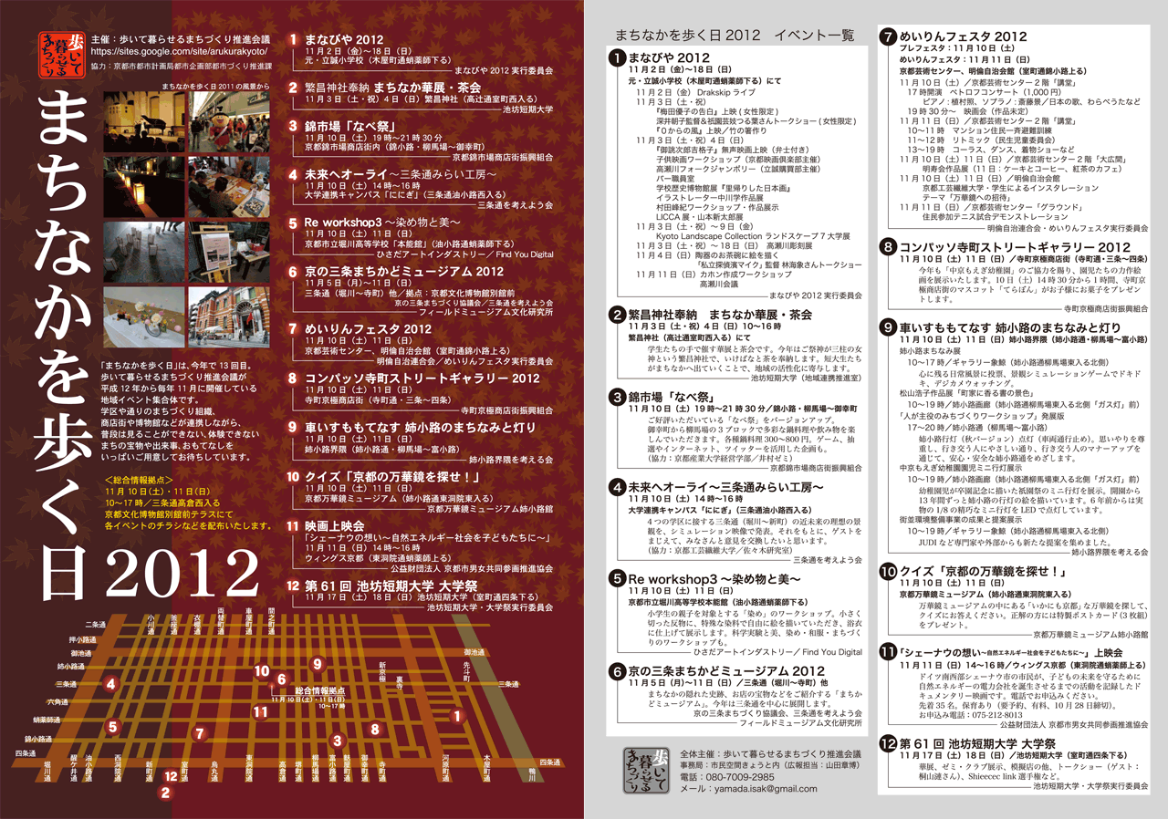 2000年から13年連続で、関連企画を実施してきました「まちなかを歩く日」。今年も、週末の二日間、屋外での「人が主役のみちづくり」と題した一連のイベントと、各会場で催される展示・イベント。普段見られない・体験できないまちの宝物や出来事の数かずとおもてなしで、皆様のご来訪をお待ち申し上げております。