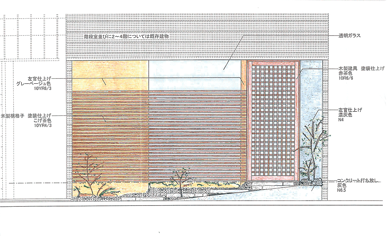 京都市へ、提出予定の図面一式も追ってご提出いただき、その立面図・正面図を拝見すると、フランス料理店でありながら、和風の落ち着いたしつらえで、姉小路界隈の品格とも調和のとれたデザインと色調であると確認されました。