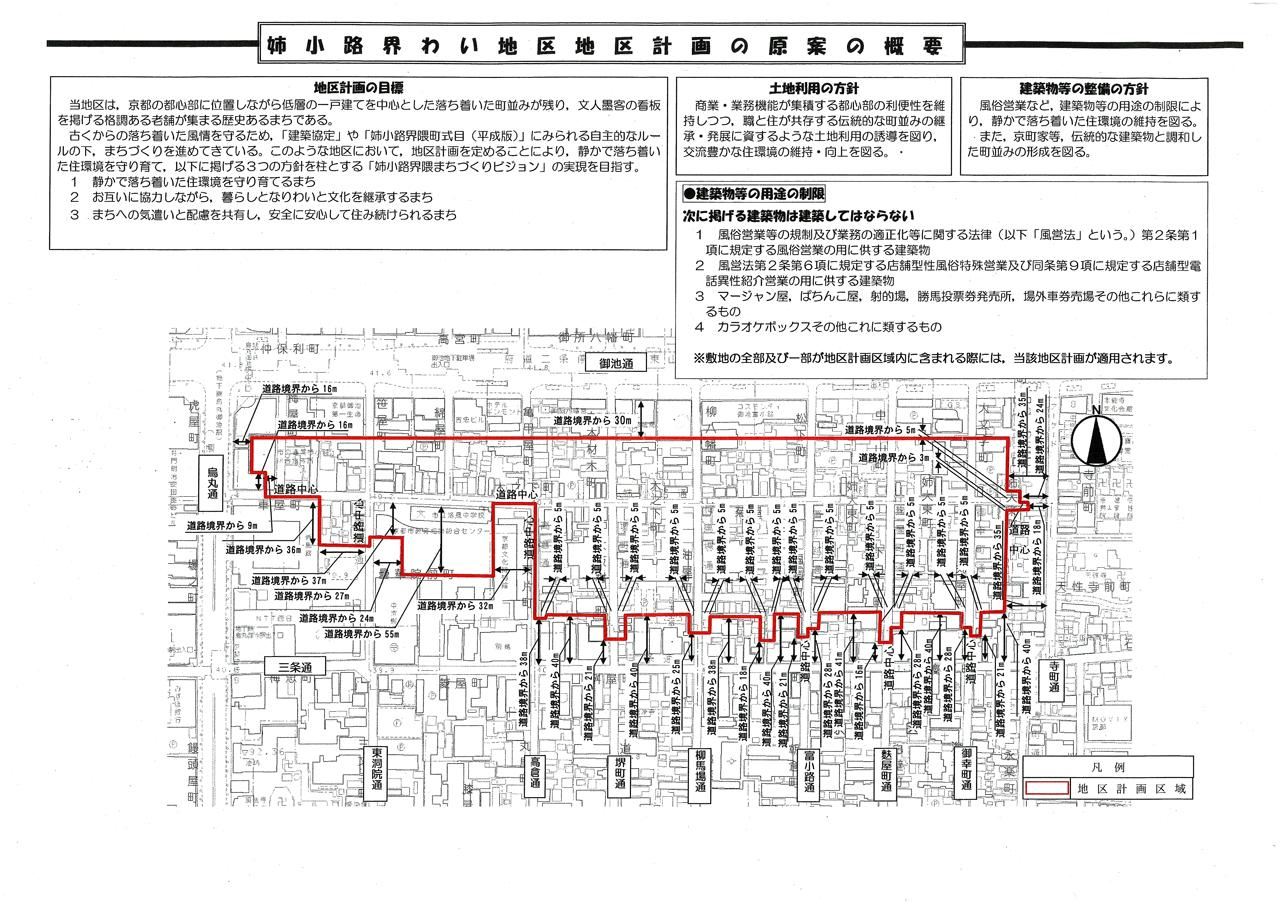 姉小路界わい地区地区計画は、「姉小路界隈町式目」にみられる自主的なルールの下に『「暮らし」と「なりわい」と「文化」のバランスを大切に育むまち姉小路界隈』の実現を図るために策定されるものです。今後、この界隈においては、風俗営業の用に供する建築物・マージャン屋・ぱちんこ屋・カラオケボックス等の建築は禁止されます。